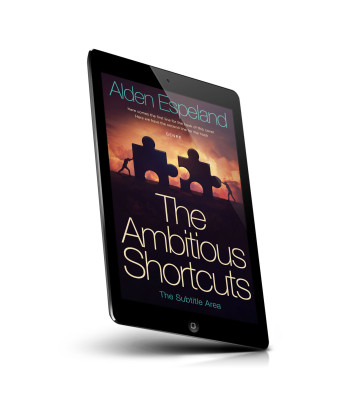 “Two figures push puzzle pieces together beneath a dramatic sky. Title "The Ambitious Shortcuts" with author's name on top.”