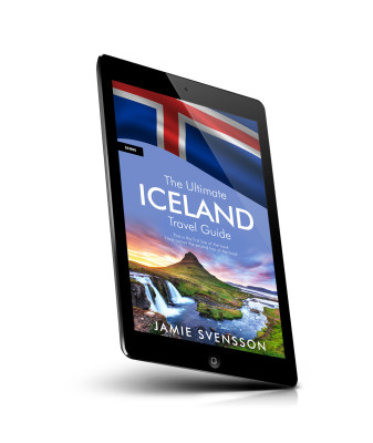“A picturesque Icelandic landscape with a waterfall and mountain beneath a waving Icelandic flag.”