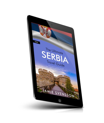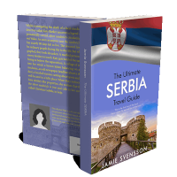 “A travel guide cover with a fortress, bridge, and Serbia's flag.”