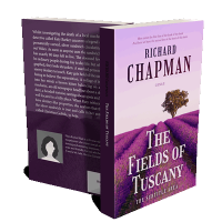 “A vast lavender field with a solitary tree under a pink sky, framed by text overlaid with the title "The Fields of Tuscany."”