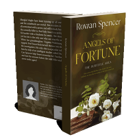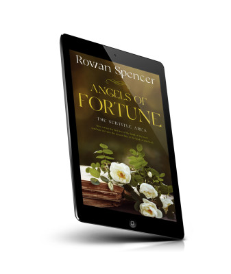 “A book cover with white roses and greenery, featuring elegant gold text on a blurred background.”