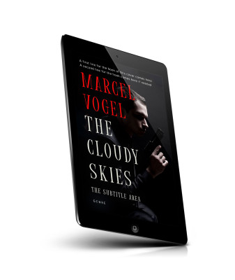 “A dark, moody book cover showing a man holding a gun near his face, with the title "The Cloudy Skies" and author's name in bold letters.”