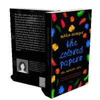 “A book cover with colorful leaves and feathers on a black background, featuring playful, handwritten fonts.”