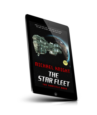 “A spaceship flies near a planet in space. Book cover with red and white text, featuring an author's name and title.”