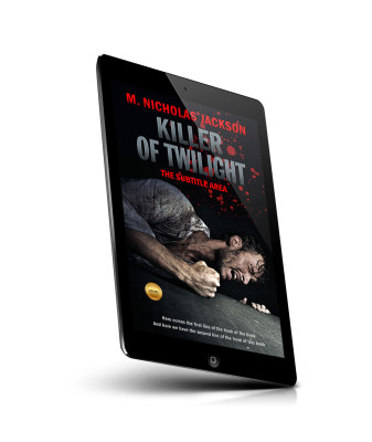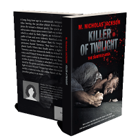 “A man in distress is lying on the ground with a blood-spattered background, front cover of a thriller book "Killer of Twilight."”