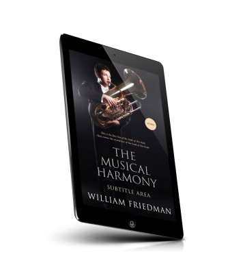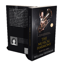 “A man in formal attire plays a tuba on a dark background, with text promoting a book titled "The Musical Harmony" by William Friedman.”