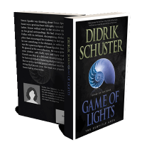 “A book cover featuring a nautilus shell design with the title "Game of Lights" in bold, and author's name "Didrik Schuster" above it.”