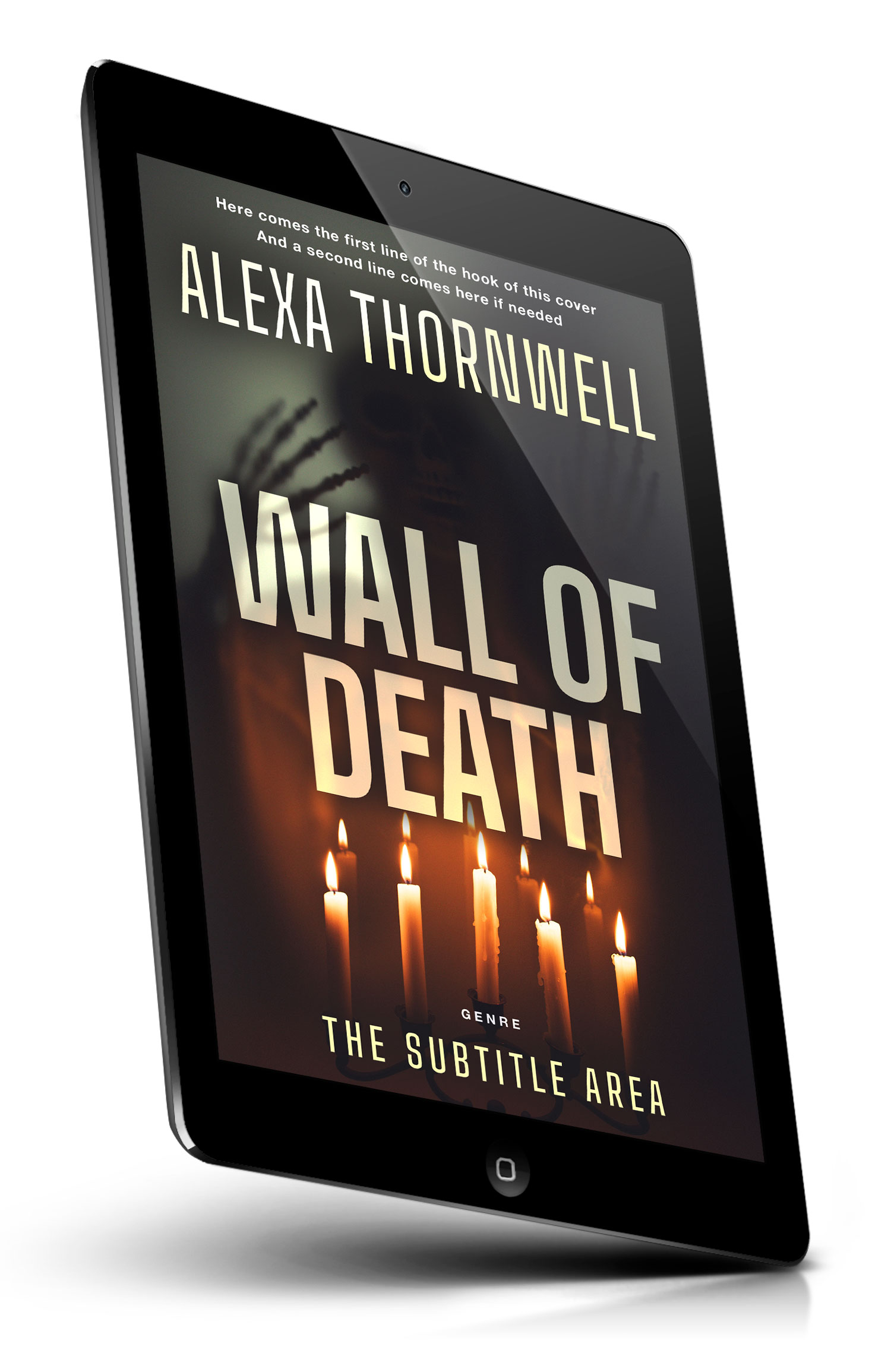 “Dark horror-style cover with a shadowy face behind fogged glass and handprints, lit by a row of glowing candles.”