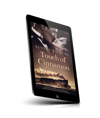“A romantic vintage-style book cover featuring a couple in formal attire and a steam train below.”