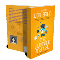 “An orange book cover with a globe, graduation cap, keyboard, and icons representing education and technology.”