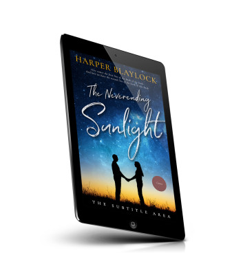 “A silhouetted couple holds hands against a starry sky background, under the title "The Neverending Sunlight."”