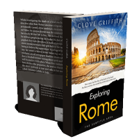 “A sunrise over the Colosseum in Rome, with a book cover layout featuring yellow and black text.”
