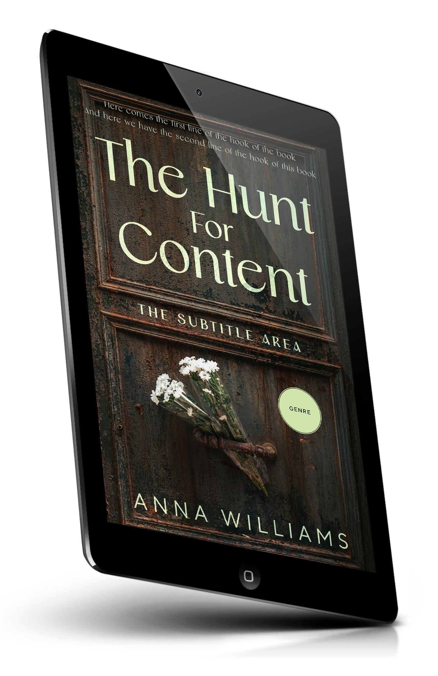 Tags: rustic door, weathered wood, old latch, floral bouquet, white flowers, wildflowers, moody lighting, vintage texture, distressed surface, dark tones, mystery, suspense, thriller, secret doorway, abandoned house, eerie atmosphere, antique panel, grunge, minimal design, dramatic cover