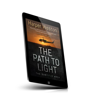 “A helicopter flies at sunset over a dark landscape with the book title "The Path to Light" in bold, textured letters.”