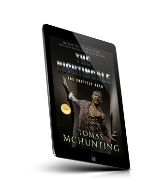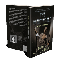 “A distressed man in a torn shirt navigates a narrow, dark corridor on the cover of a book titled "The Nightingale."”