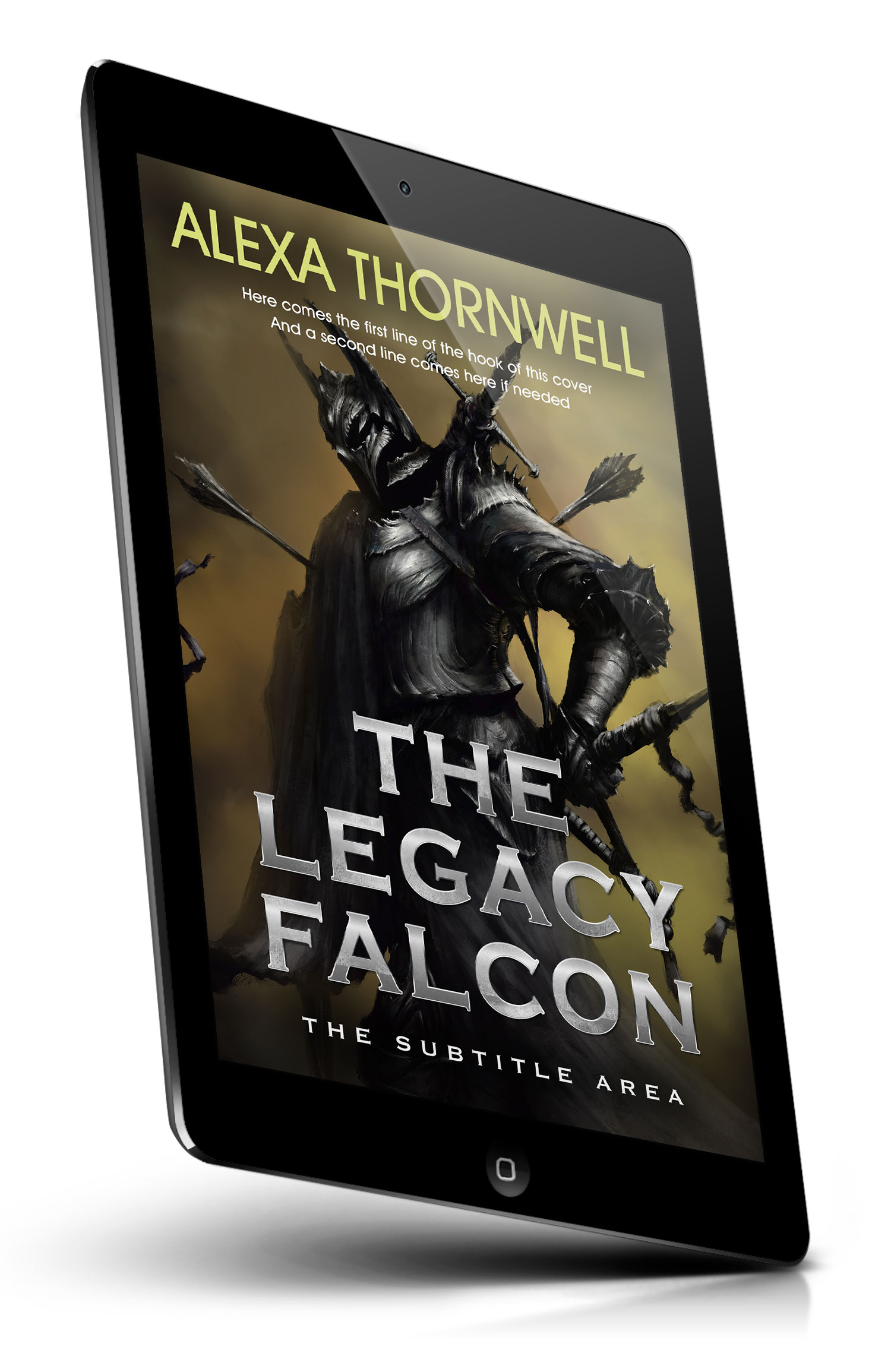 “Dark fantasy book cover showing a black-armored knight with a horned helmet and arrows stuck in the armor.”