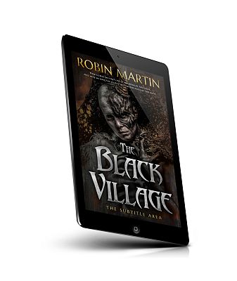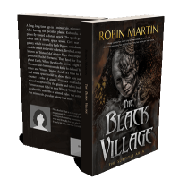 “A person with a scarred face in dark, tattered clothing stands against a fiery background. The title "The Black Village" is displayed prominently.”
