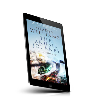 “A futuristic cityscape with a flying spaceship, and a book cover with a blue and white color scheme.”