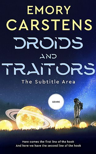 This book cover has 3 lines for the title, 1 line for the subtitle, 2 lines for the author, 2 lines for the hook, and finally 1 line for the genre.