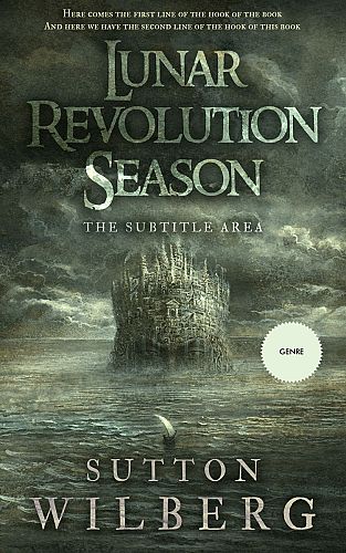 This book cover has 3 lines for the title, 1 line for the subtitle, 2 lines for the author, 2 lines for the hook, and finally 1 line for the genre.