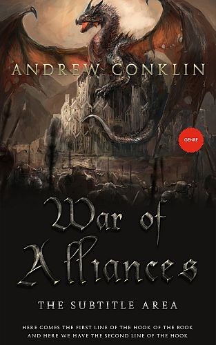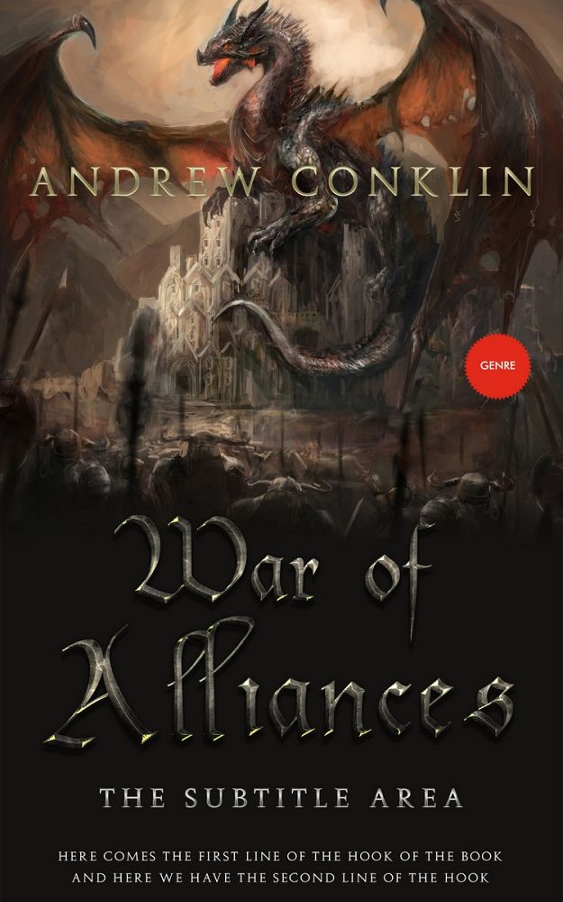 This book cover has 2 lines for the title, 1 line for the subtitle, 1 line for the author, 2 lines for the hook, and finally 1 line for the genre.