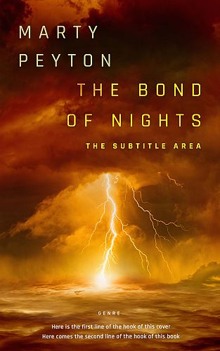 This book cover has 2 lines for the title, 1 line for the subtitle, 2 lines for the author, 2 lines for the hook, and finally 1 line for the genre.