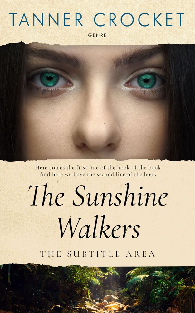 This book cover has 2 lines for the title, 1 line for the subtitle, 1 line for the author, 2 lines for the hook, and finally 1 line for the genre.