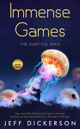 This book cover has 2 lines for the title, 1 line for the subtitle, 1 line for the author, 2 lines for the hook, and finally 1 line for the genre.
