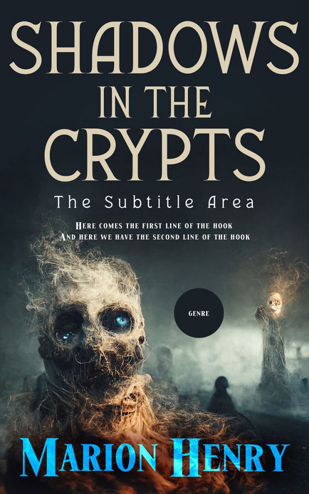 This book cover has 3 lines for the title, 1 line for the subtitle, 1 line for the author, 2 lines for the hook, and finally 1 line for the genre.